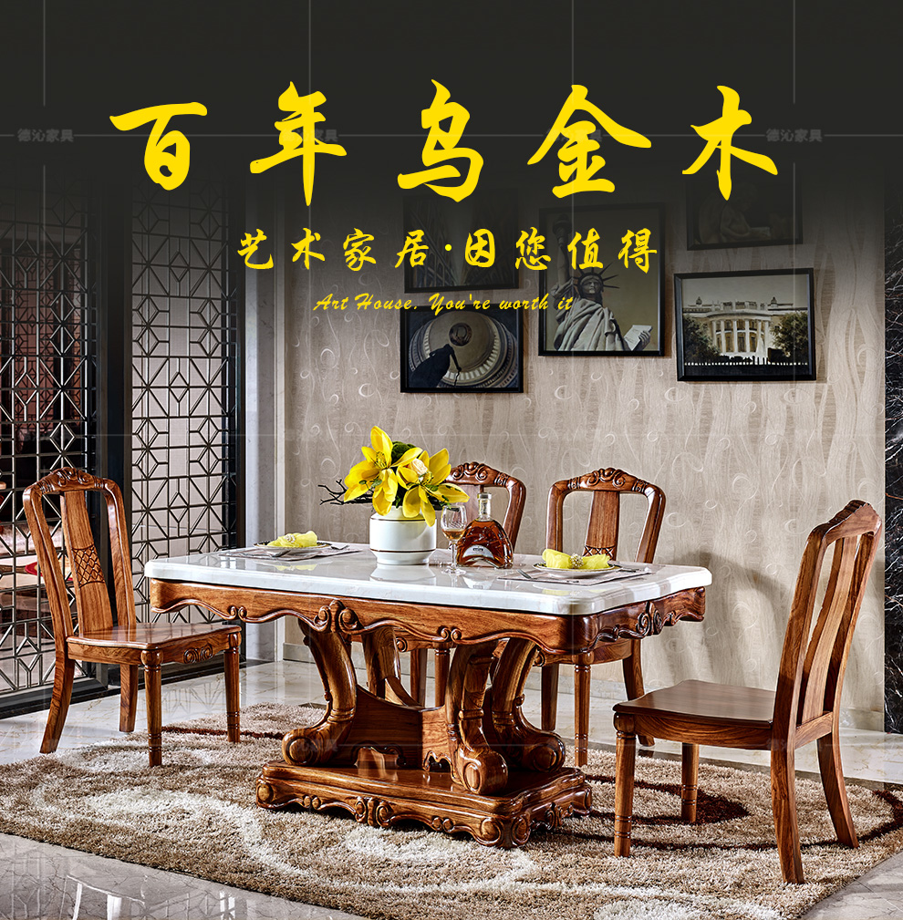 ウキンウッドダーリングテーブル天然大理石テーブルテーブルテーブル欧式アメリカ式简欧新中国式豪華な大部屋型別荘レストランリビングセット家具セット徳沁朗から烏金木+天然大理石【160*90*80 cmデニングテーブル】